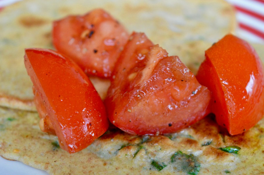 Heerlijke peterselie pannenkoekjes met tomaten salade! Deze pannenkoekjes zitten vol vezels en eiwitten. Hierdoor geven ze je een verzadigd gevoel waar je de hele middag mee door kunt komen. De tomatensalade combineert heerlijk met de peterseliepannenkoekjes en voorziet je bovendien in een deel van de groenten die je dagelijks nodig hebt. Ook makkelijk: je kunt de pannenkoekjes een dag van te voren maken zodat je ze mee kunt nemen als lunch voor op je werk.