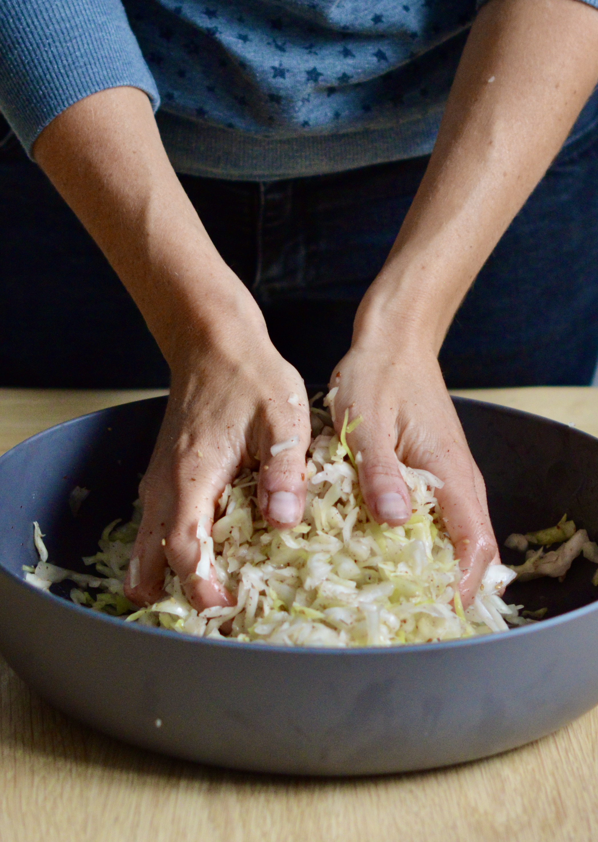 Het fermenteren van witte kool was vroeger een manier om groenten langer te bewaren. Heel handig als je in het najaar tientallen witte kolen van het land of uit de moestuin haalde die je bij lange na niet allemaal op kon voordat ze gingen rotten. Door de groenten te fermenteren kan je ze veel langer bewaren. De melkzuurbacteriën die van nature op de kool voorkomen doen eigenlijk al het fermentatiewerk. Na het fijnsnijden van de kool wordt er zout toegevoegd en wordt de kool uitvoerig gekneed. Door het zout en het kneden komt er veel vocht uit de kool. Door de kool vervolgens luchtdicht en onder het vocht te bewaren zorg je ervoor dat de melkzuurbacteriën de suikers uit de kool om kunnen zetten in melkzuur. Door dit melkzuur worden de groenten zuur. Afhankelijk van de temperatuur en de koolsoort duurt het fermentatieproces 3 tot 8 weken. Ziekteverwekkende schimmels of bacteriën krijgen door het zure milieu en het luchtdicht bewaren van de groenten in een weckpot of zuurkoolpot, geen kans om de groenten te laten bederven. Op deze manier vangen we 2 vliegen in één klap: je kunt de groenten langer bewaren omdat schimmels en ziekteverwekkende bacteriën de groenten niet meer kunnen bederven, én je kweekt je eigen probiotica. Probiotica zijn gezonde bacteriën die van nature voorkomen in gefermenteerde voeding. Het zijn dus de melkzuurbacteriën in zuurkool, maar ze zitten ook in yoghurt (yoghurt is gefermenteerde melk) en gefermenteerde kazen zoals hüttenkäse. Deze bacteriën zijn goed voor het microbioom in je darm (ook wel darmflora genoemd) en hebben veel positieve effecten op de gezondheid.