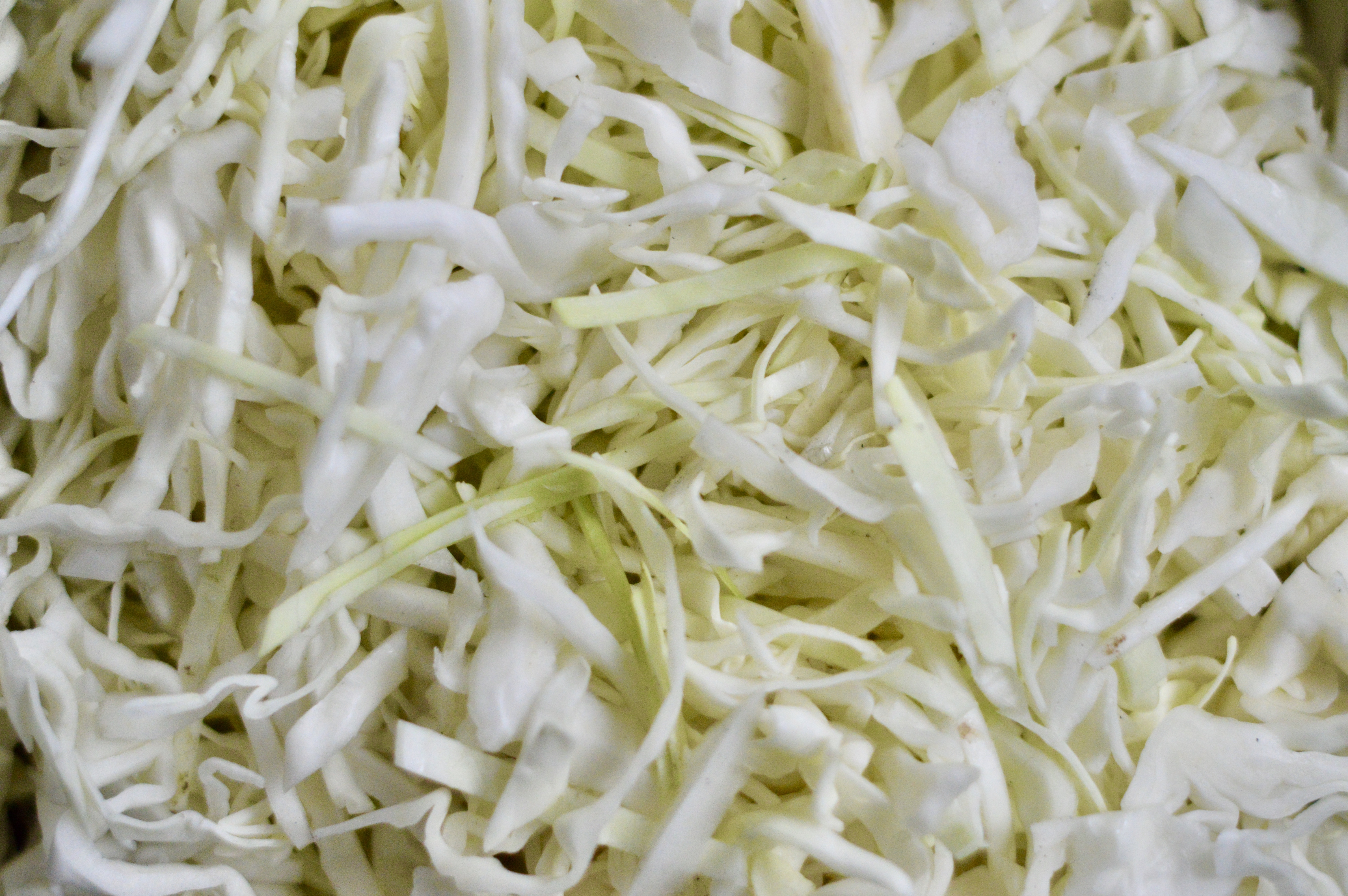 De meeste zuurkool wordt gemaakt van witte kool, maar je kunt ook spitskool gebruiken. Ik had in mijn moestuintje nog een witte kool van vorig jaar staan. In principe zaai en oogst je witte kool in één jaar maar dat was voor mijn witte kool blijkbaar niet voldoende. Die heeft er een jaartje langer over gedaan om voldoende groot te worden. Het verbaasde me dat de kool na de winter gewoon verder groeide, maar prima dacht ik, ik kijk wel wat het wordt. Begin oktober vond ik de tijd rijp om de kool te oogsten en in te maken voor zuurkool.