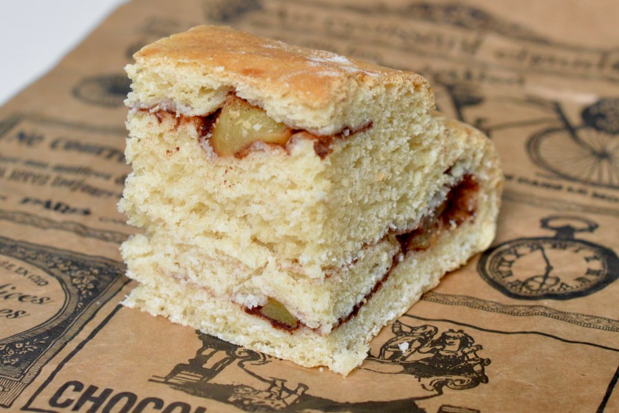 Druk het deeg op een licht met bloem bestrooid bakpapier uit tot een rechthoekige lap van circa 40×20 cm. Meng de suiker en het kaneel en strooi dit over de lap. Strooi de stukjes appel over het suiker/kaneel-mengsel. Rol het deeg in de lengte op en vouw de zijkanten terug over de rol. Keer om zodat het deeg met de gevouwen zijkanten naar beneden ligt. Leg het op een bakplaat, bedek met plasticfolie en zet nogmaals 1 uur op een warme plaats.