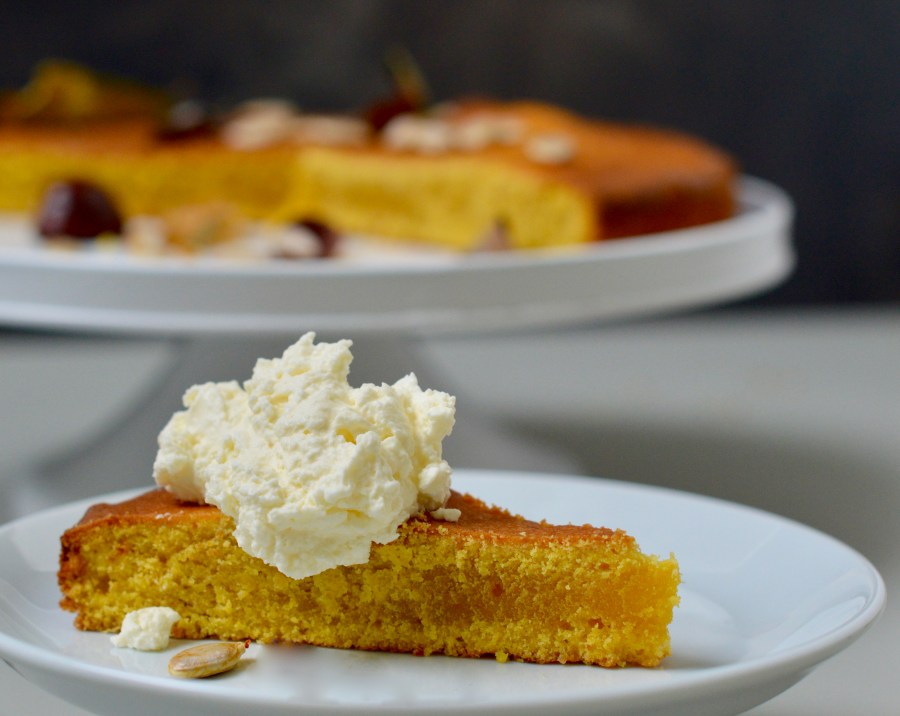 Ook deze taart verschijnt wel eens op tafel binnen de 80/20 regel. Ik heb altijd wel wat pompoen over als we er één in huis gehaald hebben. De pompoen gaar ik in parten in de oven (besprenkeld met olijfolie, 30-40 minuten op 200 graden) en gebruik ik vervolgens om puree van te maken die ik gebruik als basis voor soep, saus , of in dit geval: taart.
